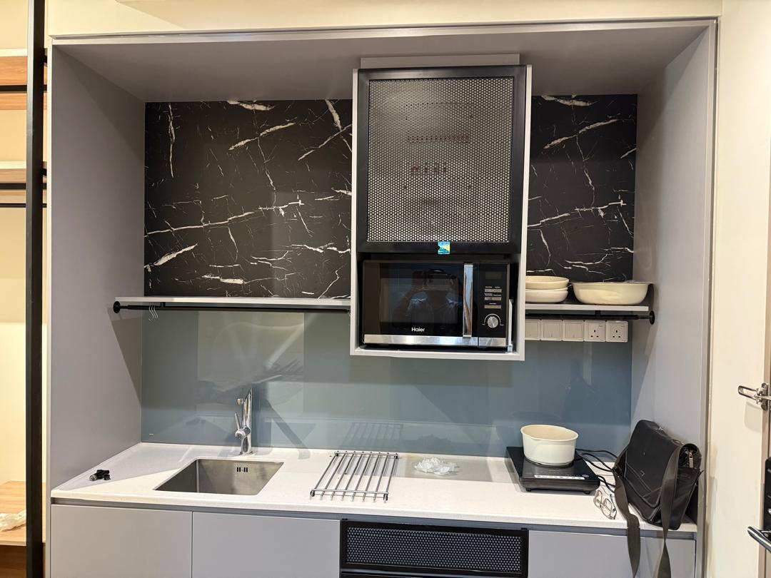 - Fully furnished with Tv cabinet,Tv, sofa,coffee table, bar fridge, queen size bed, washing machine, table & chair.